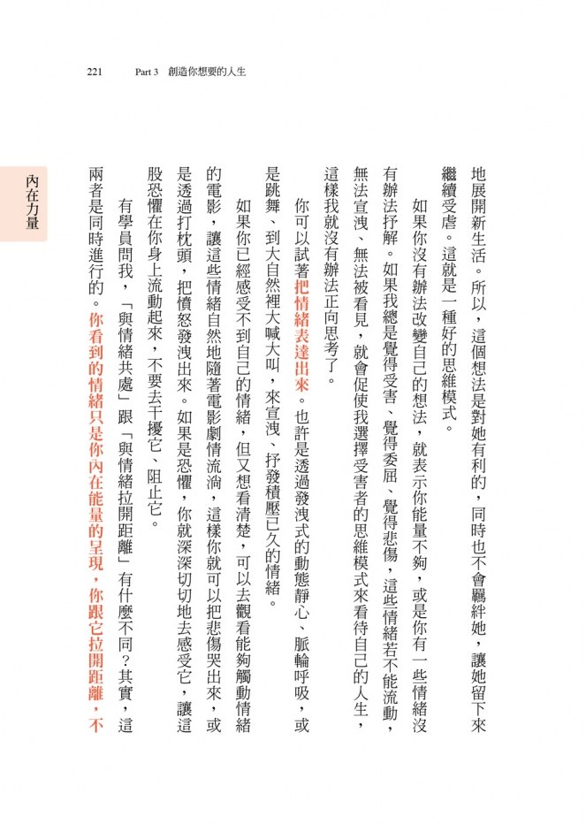 如果能夠被喚醒,承認人生的責任大部分操之在己,並決心脫離受害者模式,那麼下一步就是要去療癒關係和創傷。在療癒階段會談到我們與金錢、與父母、與子女、與親密伴侶的關係,德芬用非常落地的實證教導,讓你看到問題的癥結,進而療癒它們;當你運用各種工具療癒自己之後,就可以隨心所欲地創造了。