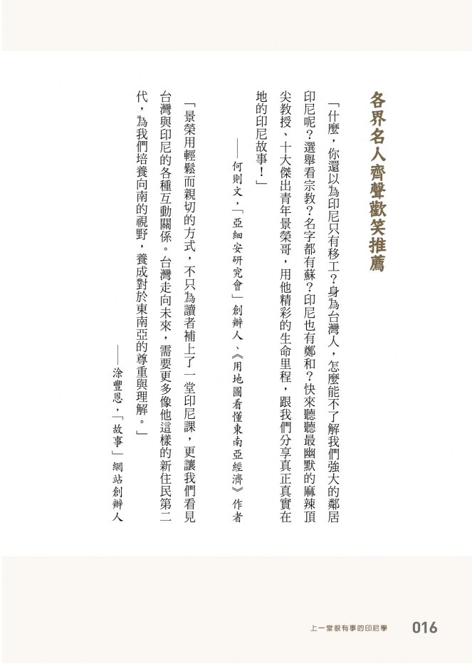 「景榮用輕鬆而親切的方式,不只為讀者補上了一堂印尼課,更讓我們看見台灣與印尼的各種互動關係。台灣走向未來,需要更多像他這樣的新住民第二代,為我們培養向南的視野,養成對於東南亞的尊重與理解。」