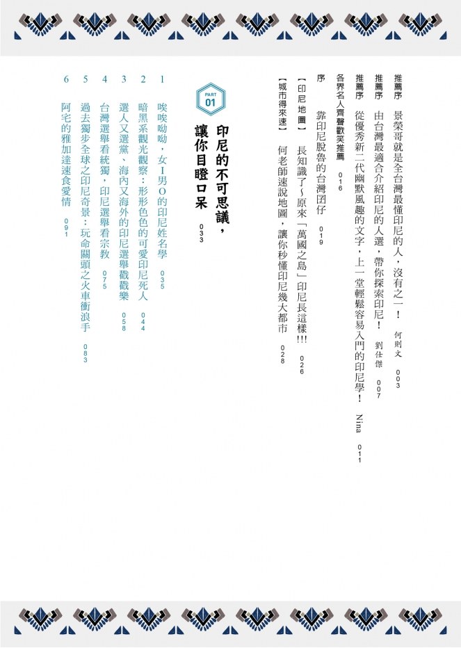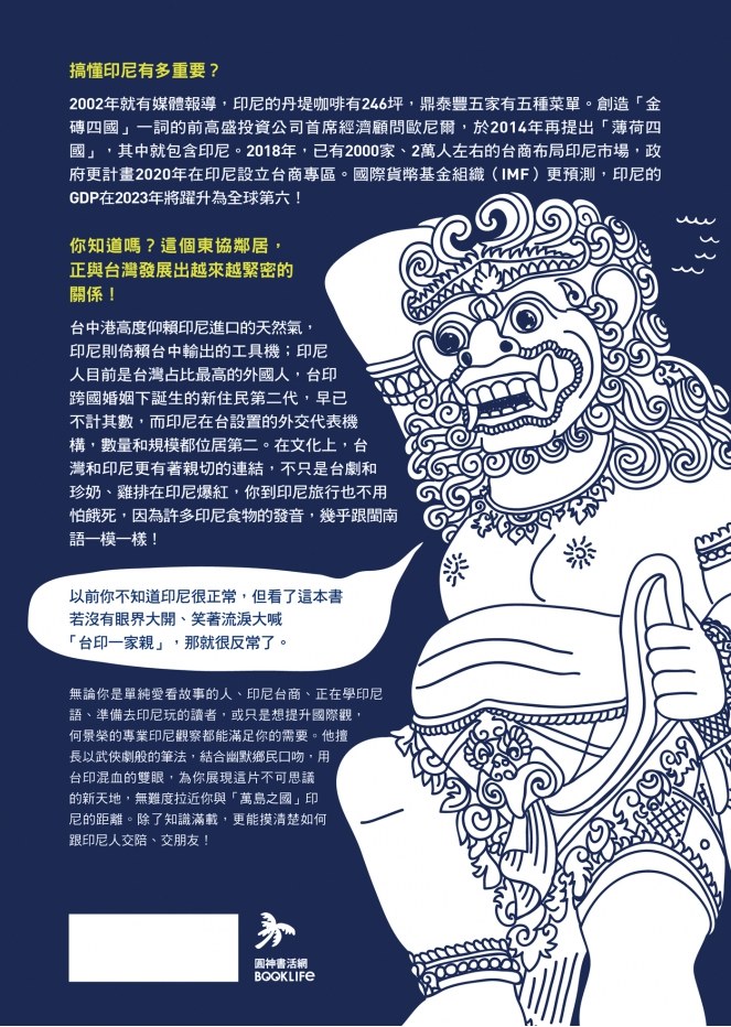 「不管是選舉、新創產業,或者媲美大甲媽的遶境、洗手間的『田野』調查,生動有趣、「嘴」之有物,絕對是你認識印尼的第一本書。」
