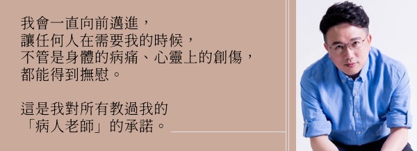 當你跨出治療的步伐,覺得痛苦難忍時,請想想你身邊愛你的人,也不要忘了,還有我在你前面。