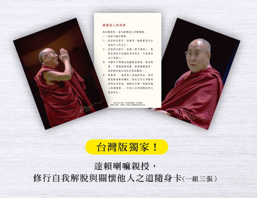 *《修行的第一堂課》大字經典樂讀版,均附贈三張日常修行隨身卡:個人的解脫戒律、關懷他人的戒律、懷抱證悟大苑修行儀式的核心