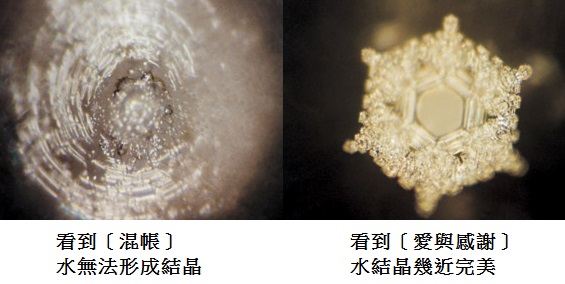 結果揭曉,簡直大大出乎意料之外。看到「謝謝」的水,呈現的是清楚而美麗的六角型結晶;相對的,看到「混蛋」的水,呈現的結晶則和聽到重金屬樂時一樣,是細碎零散的結晶。
