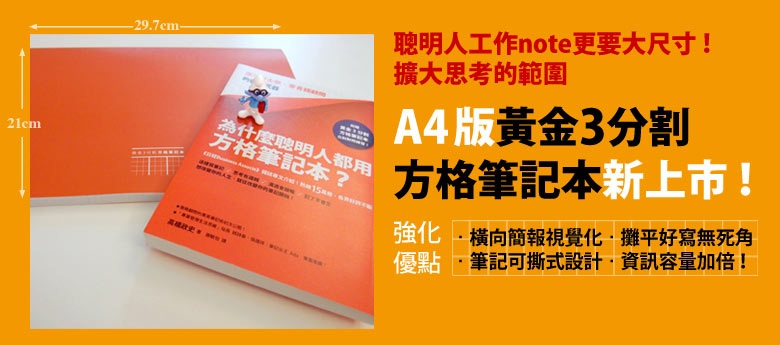 通常我們都覺得小尺寸、放手掌或甚至能放口袋的筆記本,很方便攜帶。看過兩萬人筆記本的高橋政史就是要指出:「筆記本的尺寸,就是思考的範圍」。如果你想要提高思考能力,現在就要暫停,立即加大筆記本的尺寸。