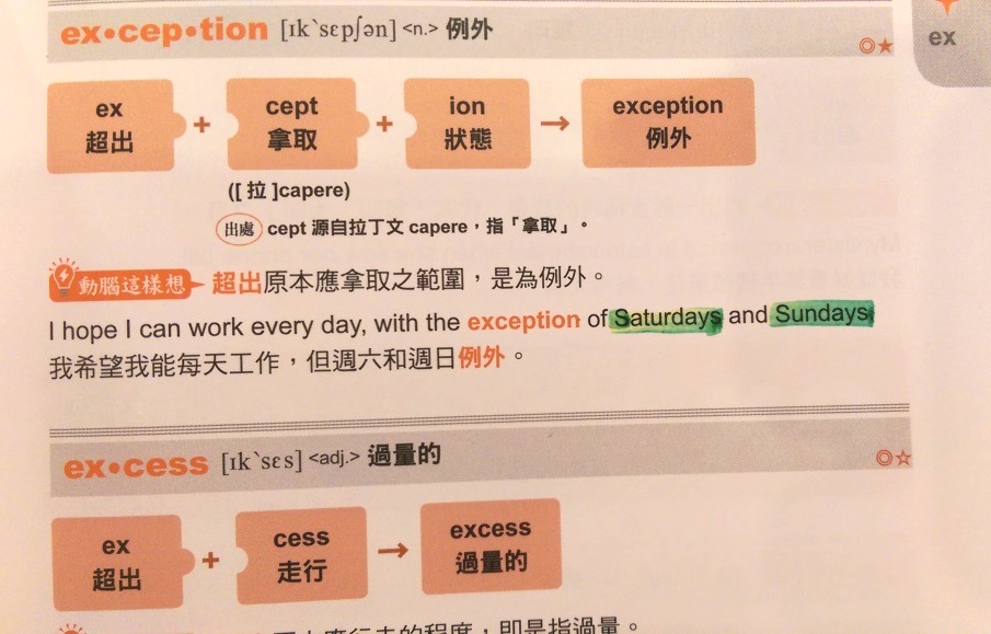 當然,如果你的手上剛好是一本套了橘色的書,恰巧使用了橘色作書中特定且需要記憶單字的顏色。用紅色暗記板搭配這種書,什麼工都不用做啦,完全是絕配。(模特兒書取材自呂宗昕教授《單字密碼:三段式解析,過目不忘,快速提升英語力》)