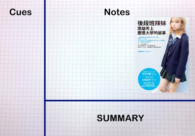 在日本暢銷直衝90萬冊,還改拍電影的超勵志學習書《後段班辣妹應屆考上慶應大學的故事》,補習班老師坪田教彩加的複習方法就是「康乃爾筆記法」。書中寫到,康乃爾筆記法的重點在於將10個重點整理成1個之後記錄下來,在家裡複習時,再從這1個重點反推回去10個重點。這樣就能有效率地進行複習。每次整理筆記的時候就像給自己考試一樣,可以說是一箭雙鵰。