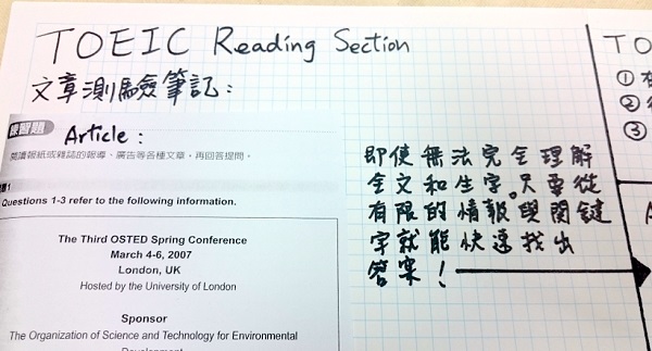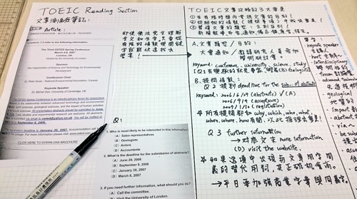 重點是把筆記做好,先熟練這個解題的方法(不要邊看邊查單字、不要想每一句都翻譯出來),