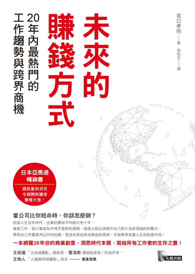 當《未來十年微趨勢》的作者馬克.潘敏銳觀察到日常生活中的微小變化,讓許多讀者想要探索,日本亞馬遜則出現暢銷書《未來的賺錢方式:20年內最熱門的工作趨勢與跨界商機》,大量的資訊與洞見,並非預言,更加興味盎然,因為充滿了源源不絕的商業火花和點子,為你一次省力了解各產業發展,馬上為自身加值,直白的告訴商業人士讀者,如何靠著趨勢跨界賺錢,就是商業版的《未來年表》。