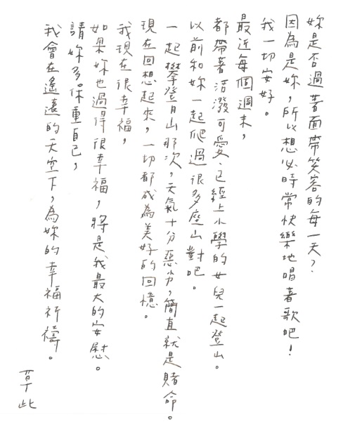 「我相信她現在一定很幸福,所以,我絕對不希望破壞她的幸福生活。如果她的先生看到用男性筆跡寫給她的私人信件,一定會很在意。尤其是自己不認識的人寫信給太太,心情必定會很複雜,如果因為這件事影響了他們的夫妻關係,不是很令人難過嗎?」