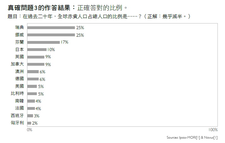 (真確問題3,各國正確答對的比例。即使漢斯.羅斯林常在瑞典媒體上討論,因此瑞典答對比例較高,但他認為25%依舊偏低)
