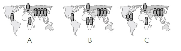 8.現今全球約有70億人,下列哪張圖正確呈現人口分布的狀況?(每個人像代表10億人)