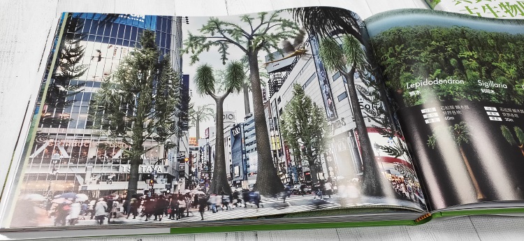 《真實尺寸的古生物圖鑑》裡也有植物類,例如上圖的鈍古蕨、鱗木,巨大樹木出現在市區壯觀的不得了!書裡有說明這時期的石炭紀,就是由這些巨大植物構成的大森林,它可是支撐人類工業革命的燃料「煤炭」的主要來源!