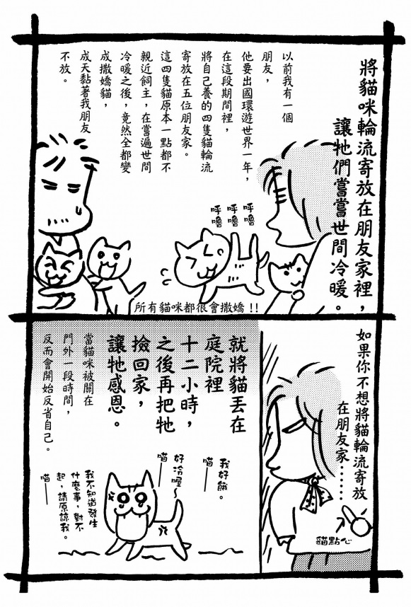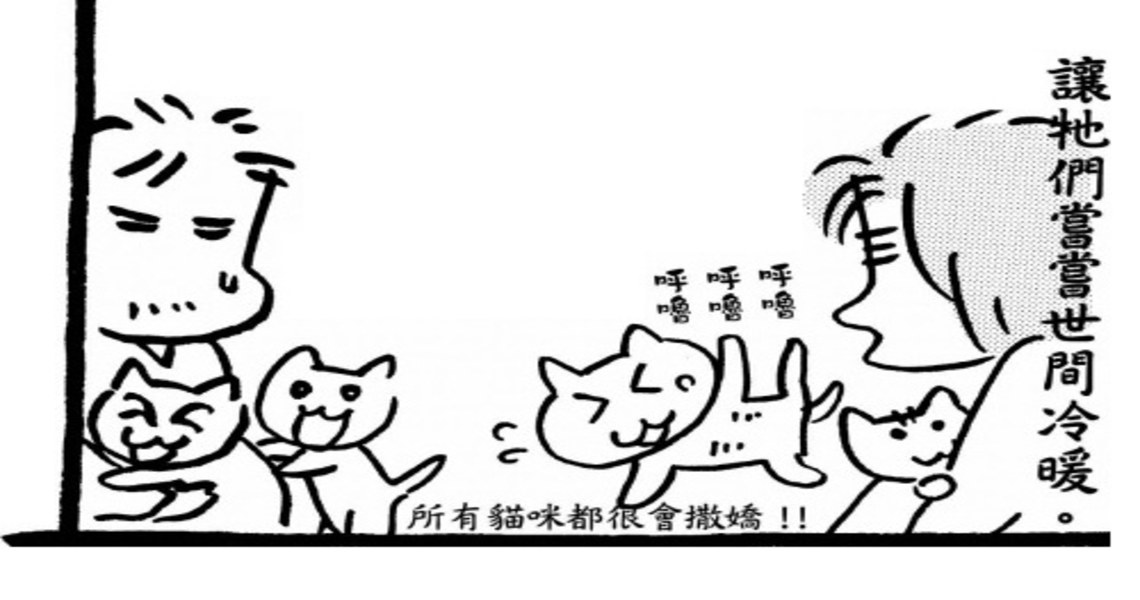 我家養了三隻貓,牠們只黏我的家人,都不黏我。四歲的公貓暢氣(取無憂無慮之意)勉強會在我們四目相接、彼此看上眼時,跳到我的膝蓋上坐著。兩歲的母貓強氣(取剛強之意)只准我摸牠的後腦勺,我要是摸其他地方,牠就會馬上逃跑,而且只要是我的手指摸過的部位,牠就會拚命舔,好像我的手有病菌一樣。另一隻三歲的母貓臆病(取膽小鬼之意)只要我一進入牠視線所及之處,立刻拔腿就跑,我們住在一起三年,我摸過牠的次數,一隻手就數得出來。