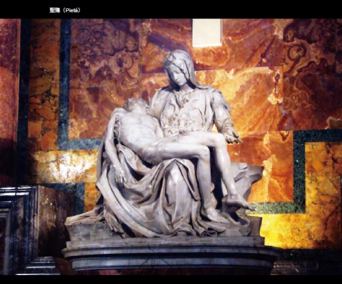 聖彼得大教堂的正殿入口,是五面一字排開、雕飾精緻華美的青銅大門。不過,真正讓我目眩神馳的,隱藏在這扇門的右後方。這件作品,是一座由卡拉拉大理石所雕刻完成的宗教聖像,當一四九九年,這座雕像出現在世人面前時,雕像的創作者還只是默默無聞、二十四歲的藝術家而已。聽說這塊卡拉拉原石從海上運來時,連一向自詡見多識廣、品味挑剔刁鑽的羅馬民眾,對它的雪白純淨也驚為天人。十八個月後,一件稀世的藝術珍品就此誕生。