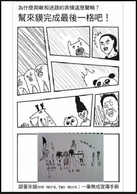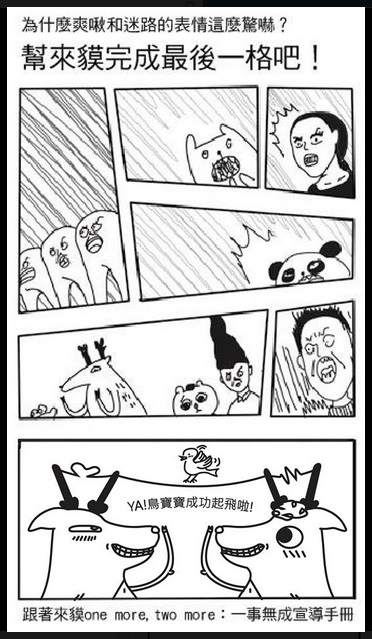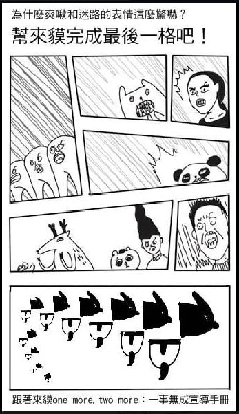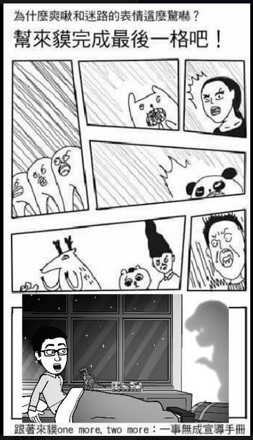 第一屆兼最後一屆的「跟著來貘看圖瞎掰大賽」,邀請讀者用下半身思考,幫來貘完成書中這頁七言絕漫的結局:(隨書還送「無法著色灰階蠟筆」,給你歐北畫)