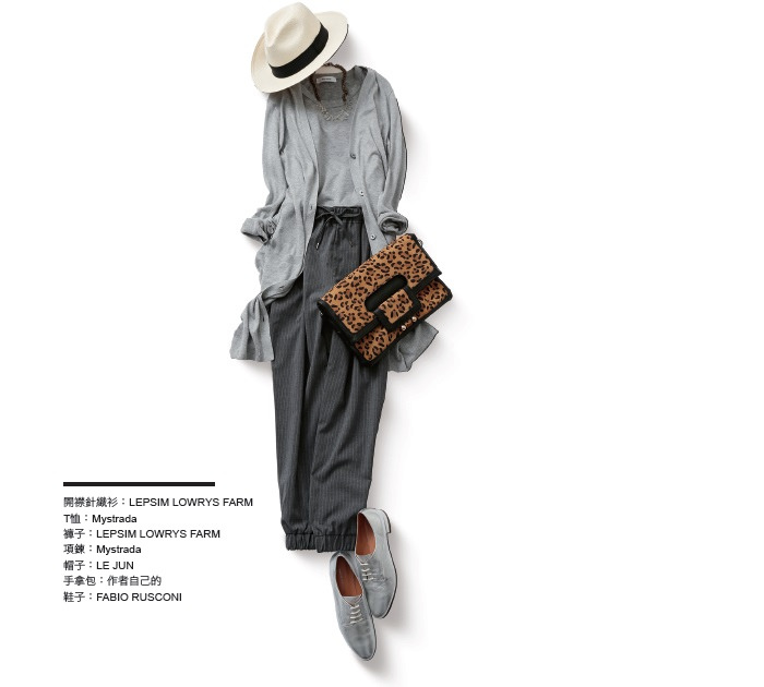 *注意到豹紋的包包嗎?動物花紋的配件絕對有加分效果,但是不要用在臉部周圍的配件上。為什麼呢?書裡的包包章節會詳細解說。
