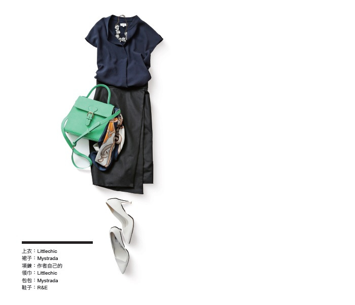 *注意到綠色的包包嗎?色澤漂亮的包包可以成為提升穿搭品味的單品。山本設計師建議包包的材質要選擇「非亮皮」,上頭的金屬配件要選沒有光澤,這樣挑選低價位也能展顯高品味!