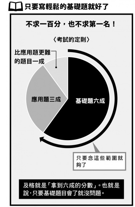 考試有一個定則。那就是「基礎題占六成、應用題占三成,比應用更困難的題目占一成」。想要及格,就要拿下基礎題目這六成的分數;換句話說,只要占所有題目六成的基礎題不失分,就能及格。由此可知,只要學好基礎就行了,困難的應用題大可不需要花力氣去做。