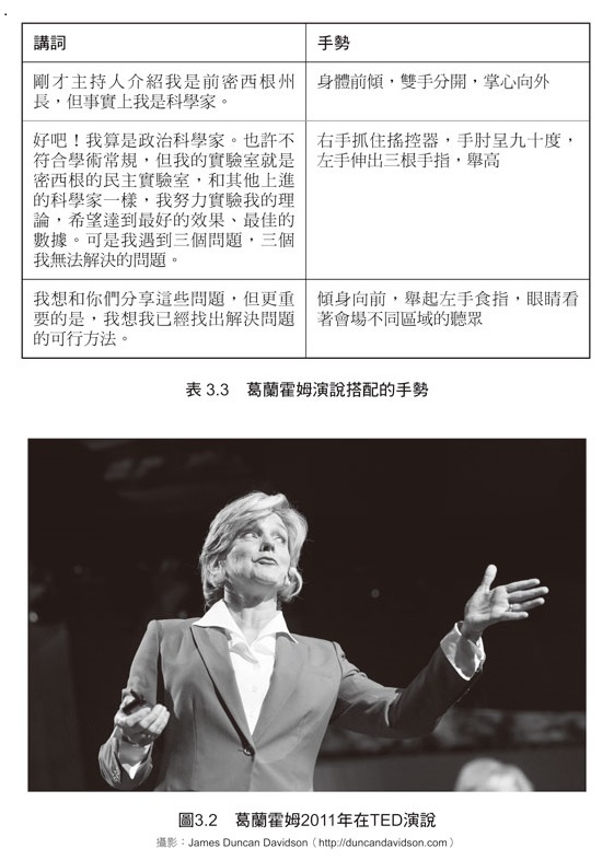 大衛.麥克尼爾博士說:雙手決定一切。這位芝加哥大學教授是手勢研究領域的權威。麥克尼爾有關鍵證據證明,手勢、思想和語言全連結在一起。在和麥克尼爾討論過後,我非常相信大多數成功的TED講者都應證了他的理論:有紀律、思想縝密、聰明、自信的主講者都會使用手勢來為他們的思考過程開一扇窗。