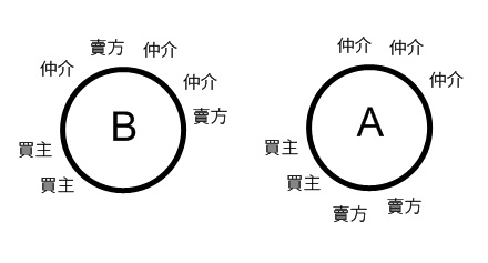 隔天在代書事務所,我本來有點擔心仲介公司會把我們跟賣方間隔成下頁圖中的模式B,沒想到仲介公司完全沒想到,所以大家就自然坐成模式A,從位子上來看就變成買方與賣方聯手對抗仲介。