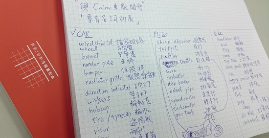 明天要跟Caine車廠開會,平常沒研究車子,從萬用英文辭典中把車子有關的專有名詞記錄下來,三欄分別寫下Car/Motor/Bike的名詞,會議當場提到某些術語,例如carburetor(化油器)至少有印象是在講什麼東西。