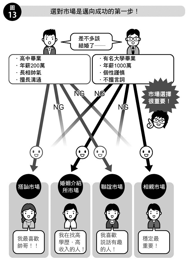 「市場感覺」應用在日常生活多麼重要,例如說,想結婚卻找不到對象的人,很可能是因為你欠缺市場感覺,找錯推銷自己的戰場。