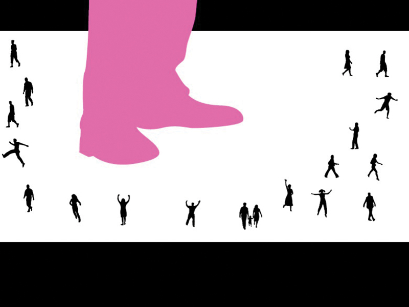 如上圖所示,這份簡報就是以「位在頁面正中央」的粉紅色雙腳為中心,改變周遭圖像所創造的動態故事。