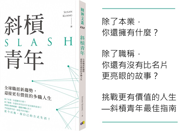 如何成為一位有價值,活得精彩的斜槓青年?《斜槓青年:全球職涯新趨勢,迎接更有價值的多職人生》,來自於引進斜槓概念的Susan Kuang跌撞成功的過程,在這本書中說飽說滿。