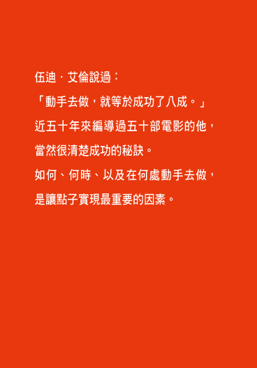 伍迪.艾倫說過: 「動手去做,就等於成功了八成。」 近五十年來編導過五十部電影的他,當然很清楚成功的秘訣。 如何、何時、以及在何處動手去做,是讓點子實現最重要的因素。