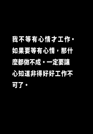 要達到偉大的創意成就,需要投入即使不到數千、也要數百小時的時間,我們必須每天撥出時間,把這些時數排進去。工作模式固定可以讓我們知道每天有多少時間可以利用,讓工作流程和體力互相配合,創作時我們的心也能有規律的節奏。