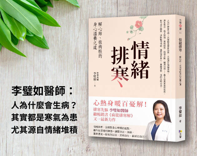七情所致的各種情緒,常是壓垮肉體健康的最後一根稻草。排寒先驅李璧如醫師在《情緒排寒》書中,說明了身體的各種疑難雜症,是心識層面種種阻滯,最終在肉體留下了印記。真正健康的人,應該由外到內都是「鬆」的,學習讓內在的陳傷一層層浮出、消融,重見清明、健康、嶄新的自己,也別把對疫情的恐懼焦慮,變成體內的寒氣!一有負荷便立即排空,沒有多餘的垃圾,致病因素便能降到最低。