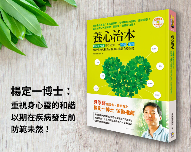 20多位專業中西醫師推薦,每個家庭必備的醫療工具書及傳家寶典,全台最能貫徹楊定一博士「真原醫預防」醫療理念的團隊共筆,幫助全家治療於未病之前,避免各種隱藏性疾病!治本,就要從養心開始!(本書附中西醫實證有效的「太極養心功法DVD」)