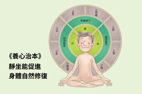 「靜坐能放鬆人的身心。放鬆之後,身體會產生嗎啡呔。嗎啡呔就像嗎啡一樣,而人體本來就存有嗎啡呔,靜坐會讓嗎啡呔釋放出來。當身心放鬆之後,心跳和呼吸都會變得非常慢,這個作用就更明顯了。」