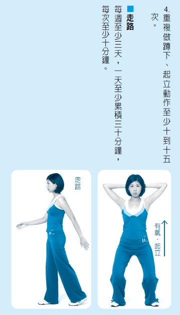 可做一分鐘起立、蹲下運動。以30秒緩慢蹲下、30秒緩慢起立,一次做10 ~ 15次。