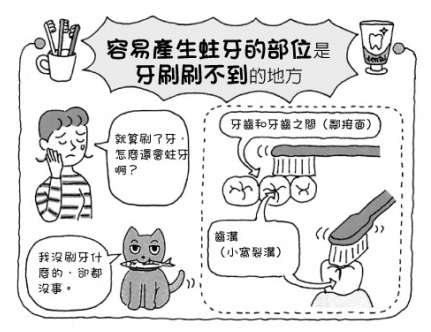 雖然這對每天拚命刷牙的人來說是個壞消息,但事實勝於雄辯,刷牙的確不能預防蛀牙。說起來,蛀牙的好發部位,也就是容易蛀牙的部分,是在牙齒和牙齒之間(鄰接面),以及臼齒的齒溝(小窩裂溝),而這些部位都是牙刷的毛尖刷不到的地方。此外,通常可以透過刷牙去除牙垢的部位,本來就是不容易蛀牙的部位。這些對牙醫來說都是很基本的常識。