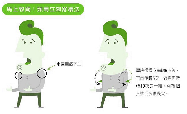 脖子或肩膀感到僵硬、疼痛時,千萬不要再左右轉動脖子發出卡卡的聲音了,這會造成頸椎第二、三節的損傷。將兩手自然放鬆下垂,聳起兩側肩膀後往前轉動、再往後轉動(如圖示),就能得到很好的鬆弛效果。只要有空就做,尤其通勤族坐公車或捷運,開車族等紅燈時就是很好的「復健」時間。