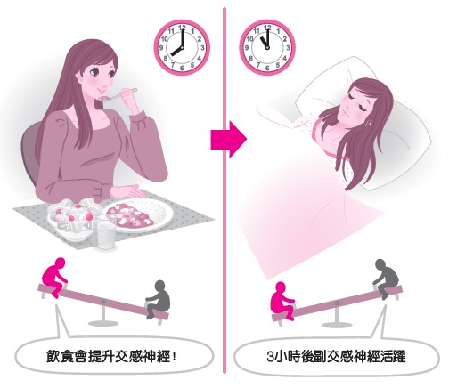 飲食時交感神經會升高,飯後為了消化食物,副交感神經就會開始活躍。飯後立刻就寢會讓人在交感神經高漲的狀態下進入睡眠狀態,導致應該由副交感神經主導的消化與吸收等腸道功能執行得不夠充分,容易引起便秘。入睡前一定要讓身體順利切換至副交感神經活躍的模式,因此晚餐必須在就寢前3小時吃完。