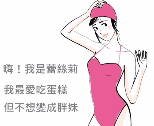 書中就由插畫版的蕾絲莉親自示範。蕾絲莉也是因為熱愛美食(法國美食阿...)擔心變胖,又不想跑步流汗。去泳池運動,又不方便拿手機看瘦身影片,看書也會溼掉。所以靈機一動自己發明了市面上第一本100%防水漂浮瘦身書。