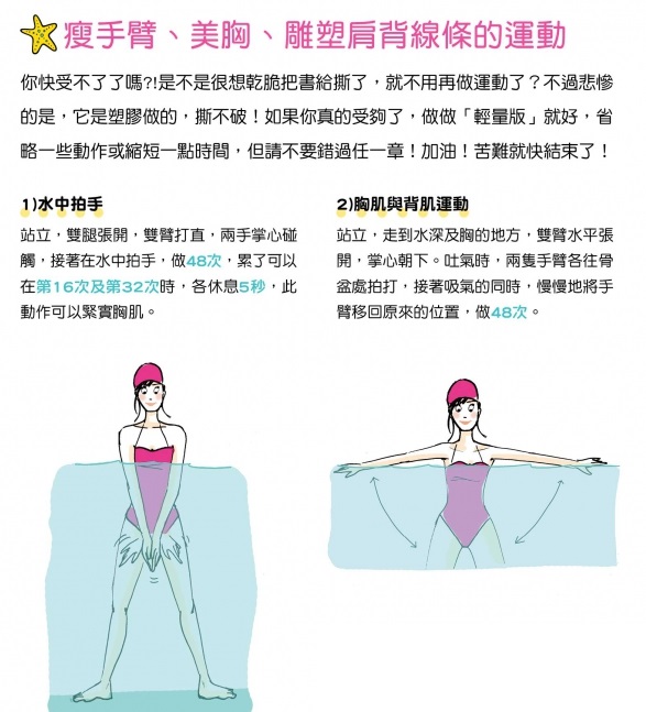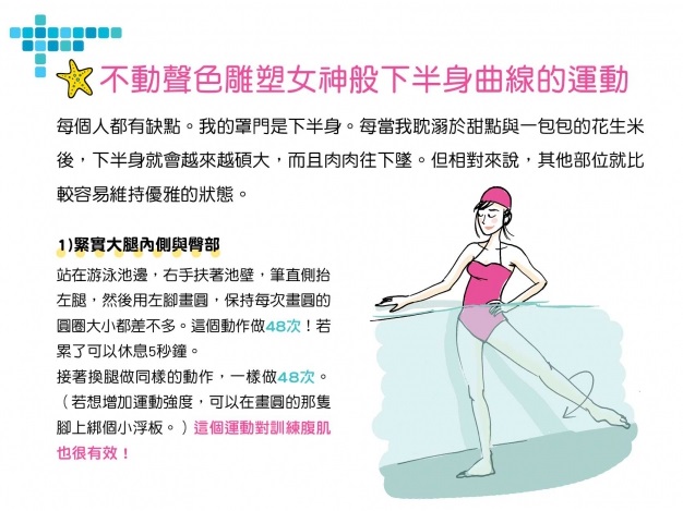 法國甚至出版了專門設計給女生在泳池運動的防水漂浮書L’Aquagym de Leslie《法國女人這樣優雅瘦》顧名思義,就是在水中也可以邊看書邊運動的意思。