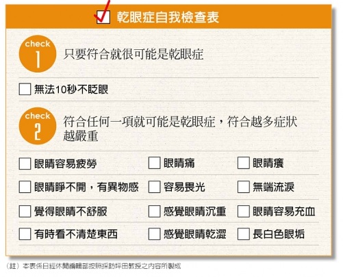 請先做個自我檢查,如果符合「check1」很可能就是乾眼症,而「check2」符合任何一個項目就有乾眼症的可能。