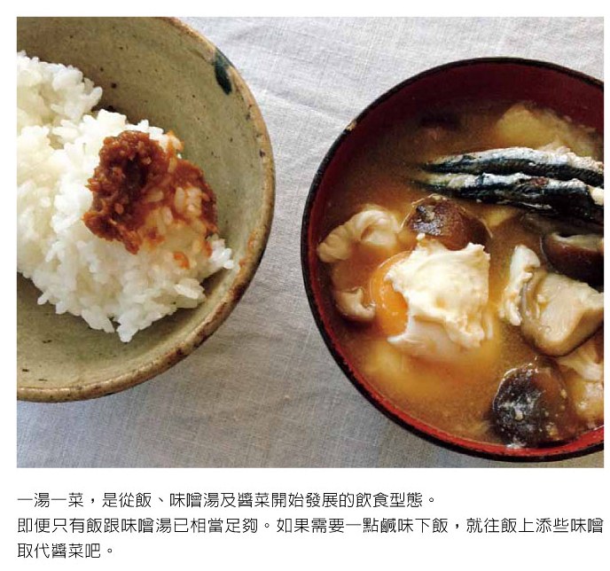 這時,我們需要的就是一湯一菜。一湯一菜,意指以飯為主,佐以熱湯與配菜的飲食型態。最基本的組合就是飯、味噌湯及醬菜。