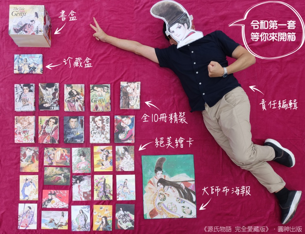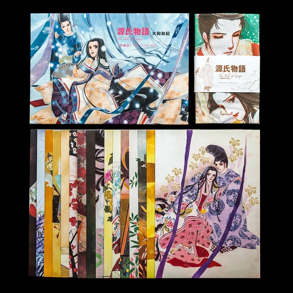 *在2019《源氏物語完全愛藏版》,華麗贈品都收納在10冊精裝書外的「珍藏盒」中。包括「大師繪卷布海報」及16張繪卡。家裡隨時可以開起小畫展。