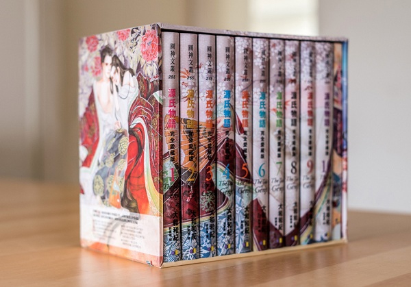 *《源氏物語完全愛藏版》10冊精裝的書背也經過設計,在書架上絢麗奪目。