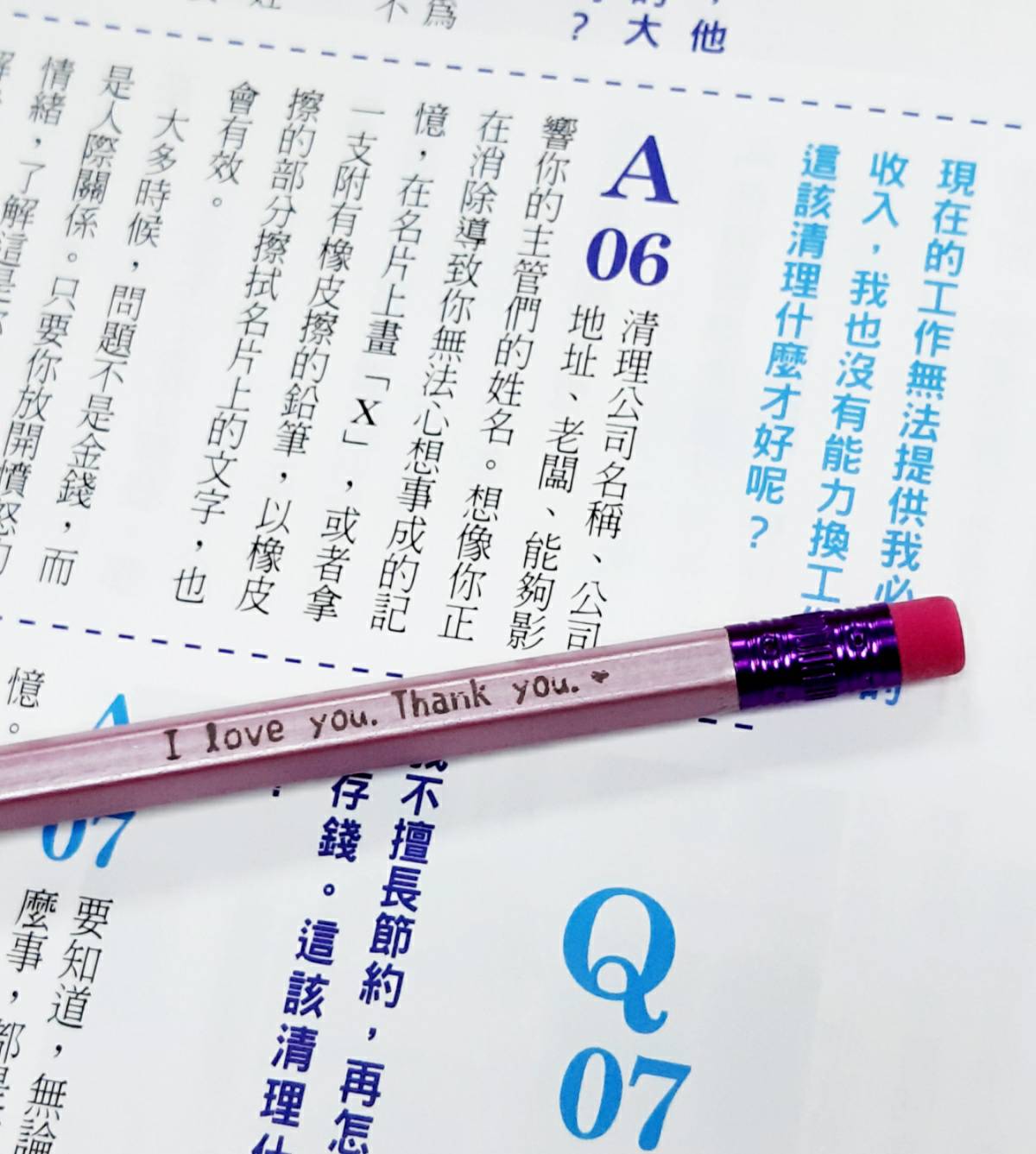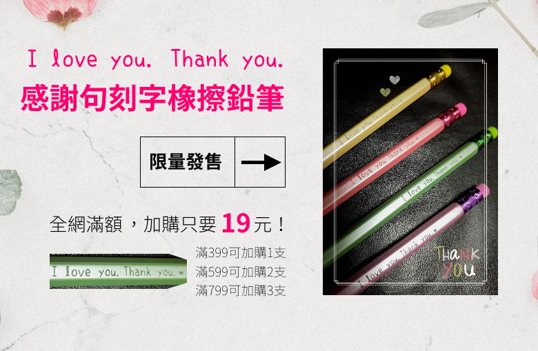【本網目前推出「I love you. Thank you.」人工雷射刻字鉛筆,全網滿399元起更可以19元加購】