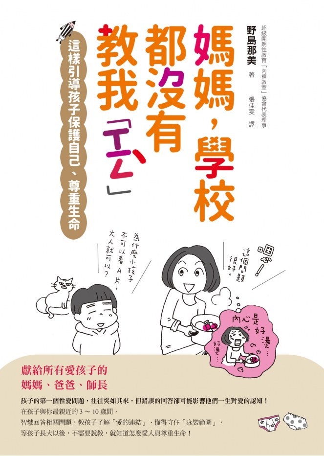 《媽媽,學校都沒有教我「性」:這樣引導孩子保護自己、尊重生命》這本書上寫了很多父母的擔憂,明確的告訴大家為什麼要性教育、教育孩子的方式。無知才會讓孩子好奇用自己的方式去搜尋、學習,我們應該讓孩子了解身體和界線,讓孩子們學會正確的性。