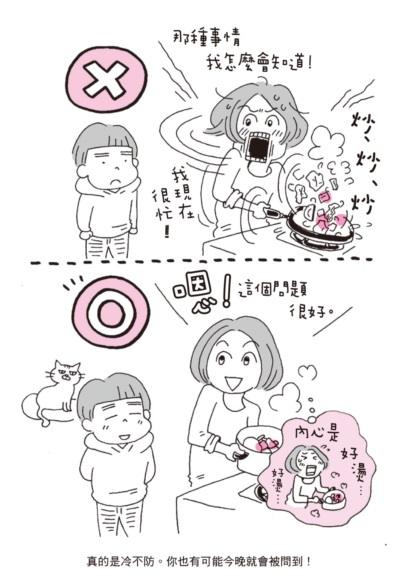 此外,或許是國情差異,野島那美認為不要期待爸爸來進行性教育。我正好抱持相反看法,男性是家庭性教育不可缺席的「師資」,這些沒能好好受過性平教育的男人,如果能坦承與孩子分享自己身體變化時造成的苦惱與愉悅,那些年在情感關係的經營碰撞,是多麼寶貴的課程啊,爸爸(或是叔叔、舅舅都可以)也有在擁擠的公車上很擔心被誤會是色狼的時候吧。總之,性教育就是從生活日常點點滴滴開始的,性是心與生命的組成,讓我們抱持著愛孩子的心情,滿足孩子對性純粹的好奇心吧!