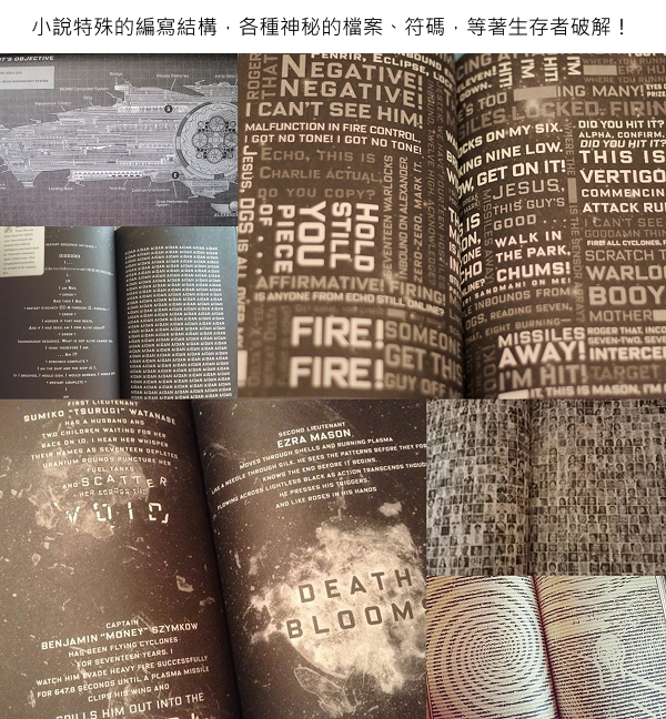 兩位作者耗時兩年,結合超強製作團隊,編排各種設計元素、諮詢天文地理醫療心理各方專家,以充滿閱讀樂趣的方式呈現出:8 篇日記 /4 份移轉船艦申請書 /3 份任務後報告 /24 封郵件往來/ 4 則官方公告/ 1 份軍方審訊名單 /6 則船艦呼叫記錄/ 12 段影像整理記錄/ 8 段對講機內容/ 1 則逃生艙錄音逐字稿 /5 段艦橋錄音檔/ 1 份醫療實驗報告/ 1 份解密百科/ 42 段對話聊天內容……