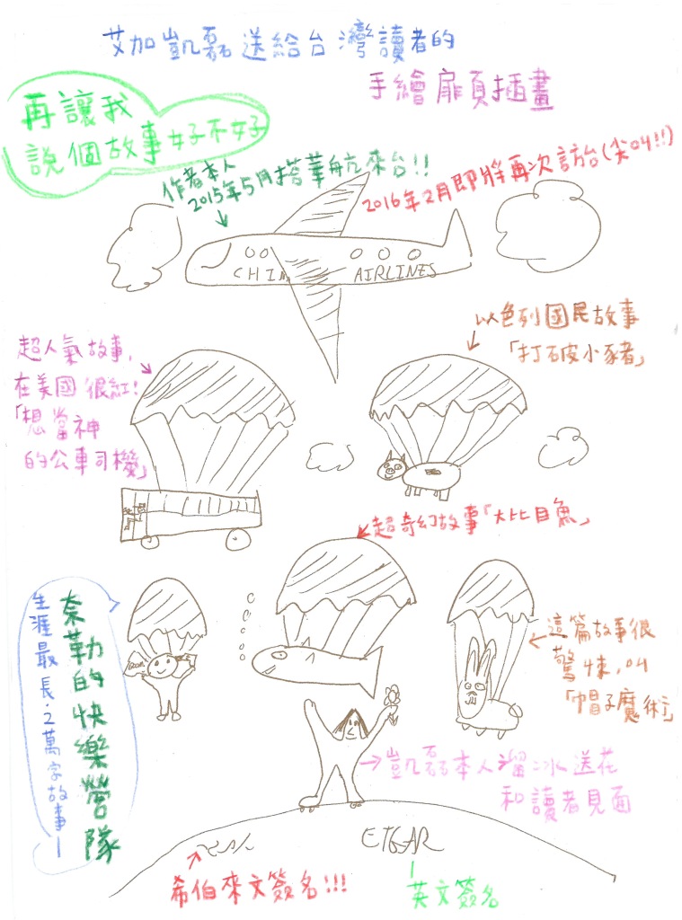例如,高空中的飛機,是他描述造訪台灣的航班,雖然他在台灣停留時間不長,可是很多感觸,這次請他寫個序還紙短情長。從飛機上,很多故事降落囉,包括以色列國民故事「打破小豬」,小編們私心很愛的「想當神的公車司機」(很寫實吧,司機停車與否的確關係到你的人生)......最後安全降落抵台的當然是艾加.凱磊自畫像,還溜冰捧花進場呢!