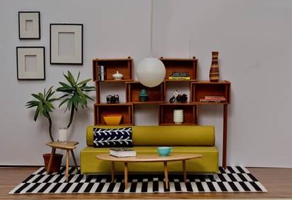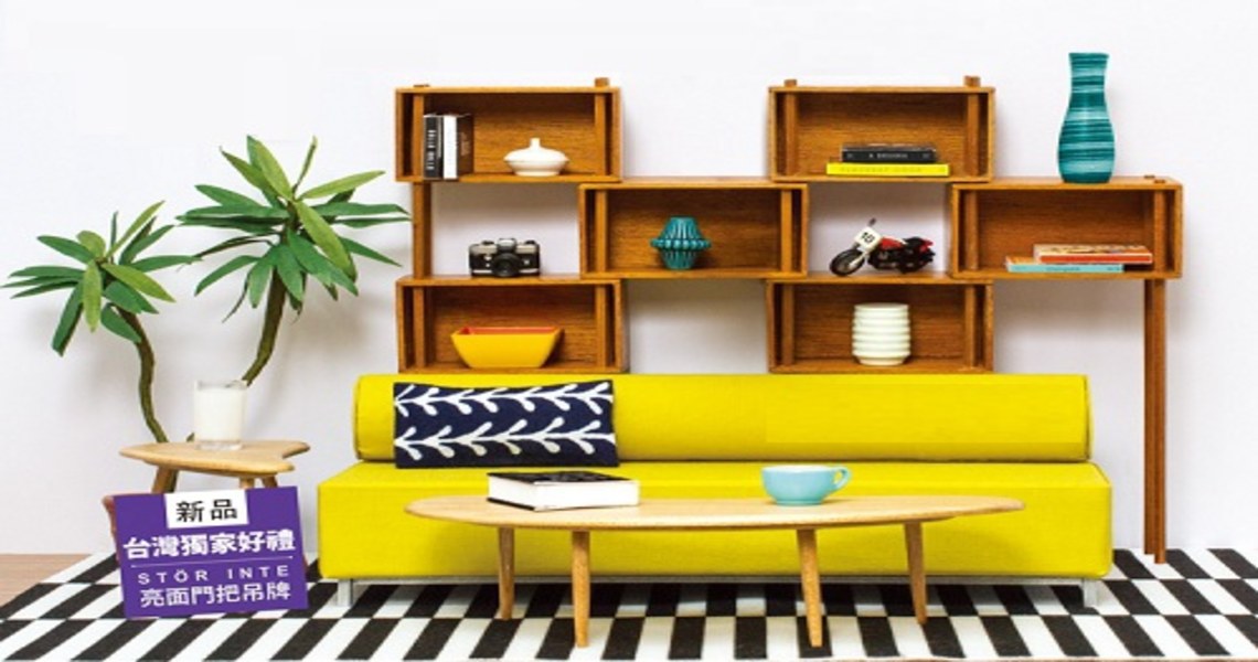 封面主圖要是家具展示間的裝潢特寫,走明亮現代風,主色調是藍色跟黃色。