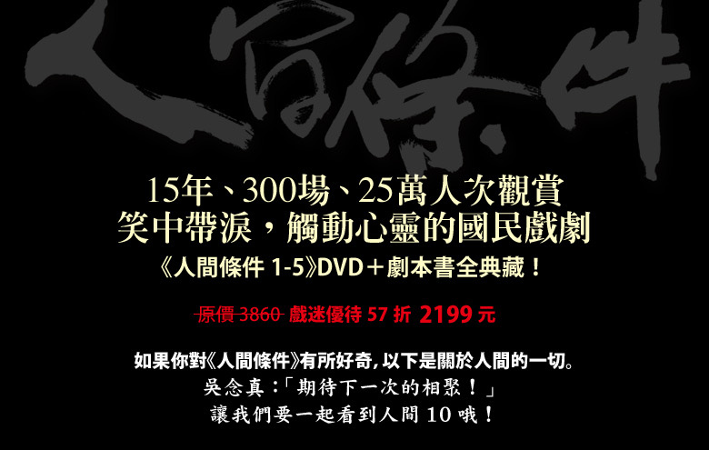 如果您還沒看過《人間條件》,這也是一份給爸媽、親朋好友一份深刻的禮物,《人間條件1-5:全典藏(劇本書+完整戲劇DVD)》是最好的選擇!(全套57折,可分售)
