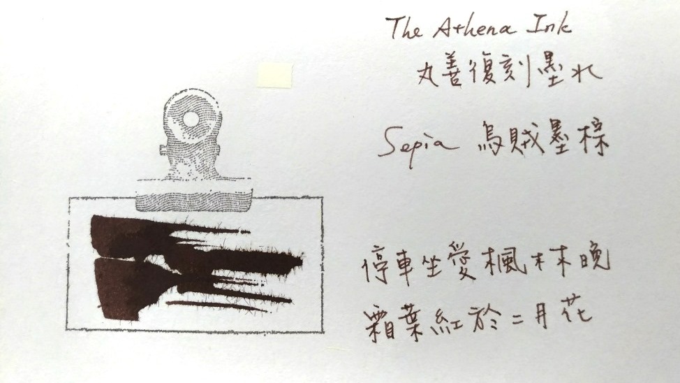 Sepia色的墨水並不少見,但各家色調略有不同,有些偏黃帶綠,也有些帶紅偏沉。這次提供給筆優書寫的,是日本丸善書店慶祝創業140週年推出的「The Athena Ink」復刻版Sepia色墨水(據說這是夏目漱石的愛用品呢)。這支墨水顏色十分內斂,剛寫時顏色較深,甚至帶一點點紫紅色(沾附在手上尤其明顯),但墨水乾後便會呈現穩重、帶些煙灰色的深褐色,果然是非常適合園田先生的墨色呢。【這個故事和最後的呈現是甚麼呢?試讀:園田先生的委託】